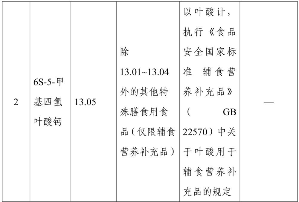 本次申請擴大使用范圍用于除13.01~13.04外的其他特殊膳食用食品(輔食營養(yǎng)補充品)(食品類別13.05),增加食品中葉酸含量。經(jīng)安全性評估,(6S)-5-甲基四氫葉酸鈣在輔食營養(yǎng)補充品中可以安全使用,其質(zhì)量規(guī)格按照國家衛(wèi)生健康委(原國家衛(wèi)生和計劃生育委員會)2017年第13號公告的相關(guān)內(nèi)容執(zhí)行。美國食品藥品管理局、歐盟委員會、澳大利亞和新西蘭食品標準局等允許其用于食品。
