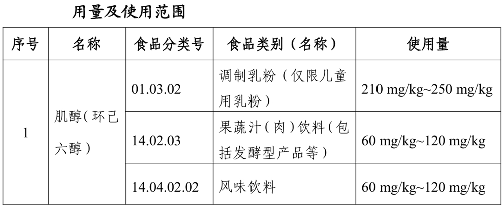 本次征求意見的肌醇是采用新的生產(chǎn)工藝制得,允許用于調(diào)制乳粉(僅限兒童用乳粉)(食品類別01.03.02)、果蔬汁(肉)飲料(包括發(fā)酵型產(chǎn)品等)(食品類別14.02.03)、風(fēng)味飲料(食品類別14.04.02.02),增加食品中的肌醇含量。經(jīng)安全性評估,新的生產(chǎn)工藝制得的肌醇在上述食品類別中可以安全使用,其質(zhì)量規(guī)格按照征求意見稿的相關(guān)要求執(zhí)行。美國食品藥品管理局、歐盟委員會、日本厚生勞動省、澳大利亞和新西蘭食品標準局允許其用于食品。