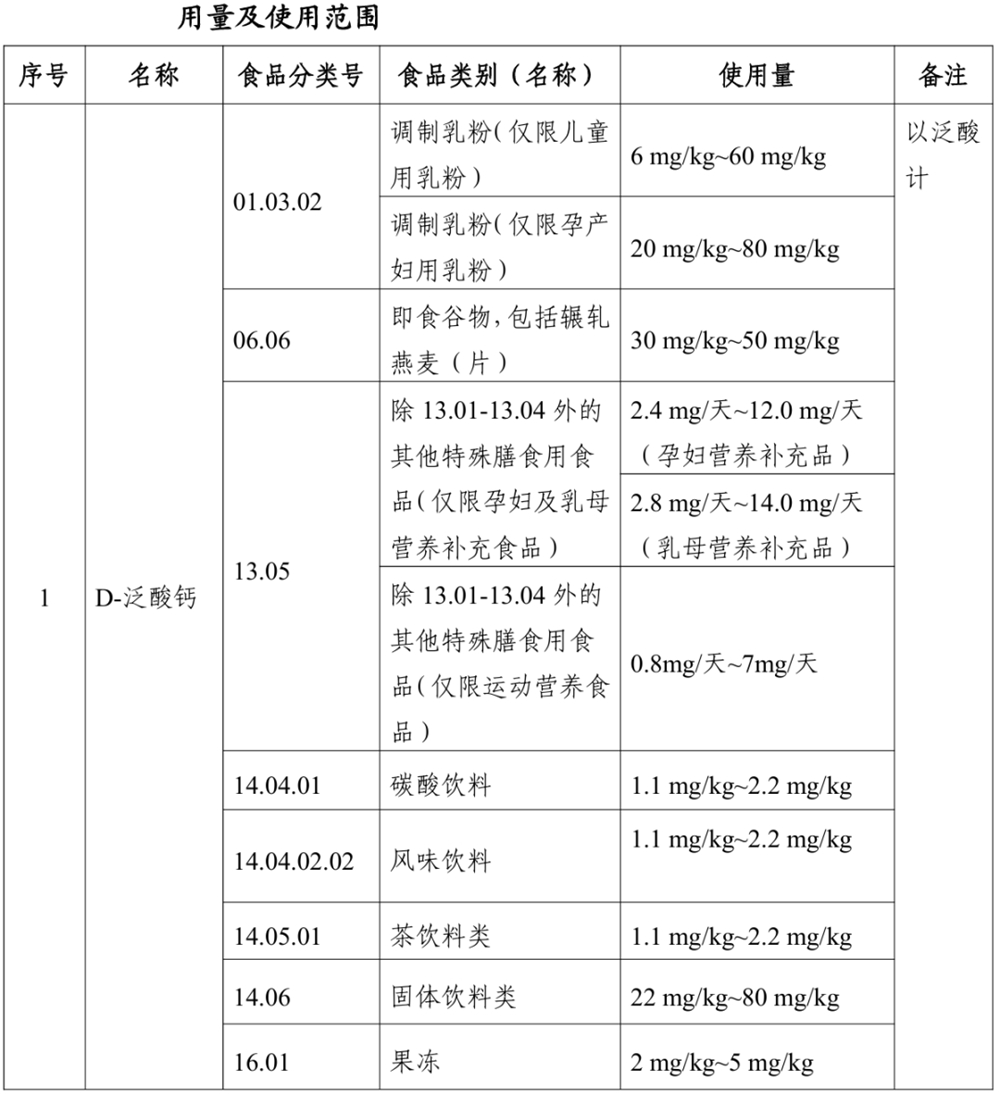 本次征求意見的D-泛酸鈣是采用新的生產(chǎn)工藝制得,允許用于調(diào)制乳粉(僅限兒童用乳粉)(食品類別01.03.02)、調(diào)制乳粉(僅限孕產(chǎn)婦用乳粉)(食品類別01.03.02)、即食谷物,包括輾軋燕麥(片)(食品類別06.06)、除13.01-13.04外的其他特殊膳食用食品(僅限孕婦及乳母營養(yǎng)補充食品、運動營養(yǎng)食品)(食品類別13.05)、碳酸飲料(食品類別14.04.01)、風(fēng)味飲料(食品類別14.04.02.02)、茶飲料類(食品類別14.05.01)、固體飲料類(食品類別14.06)、果凍(食品類別16.01),增加食品中泛酸的含量。